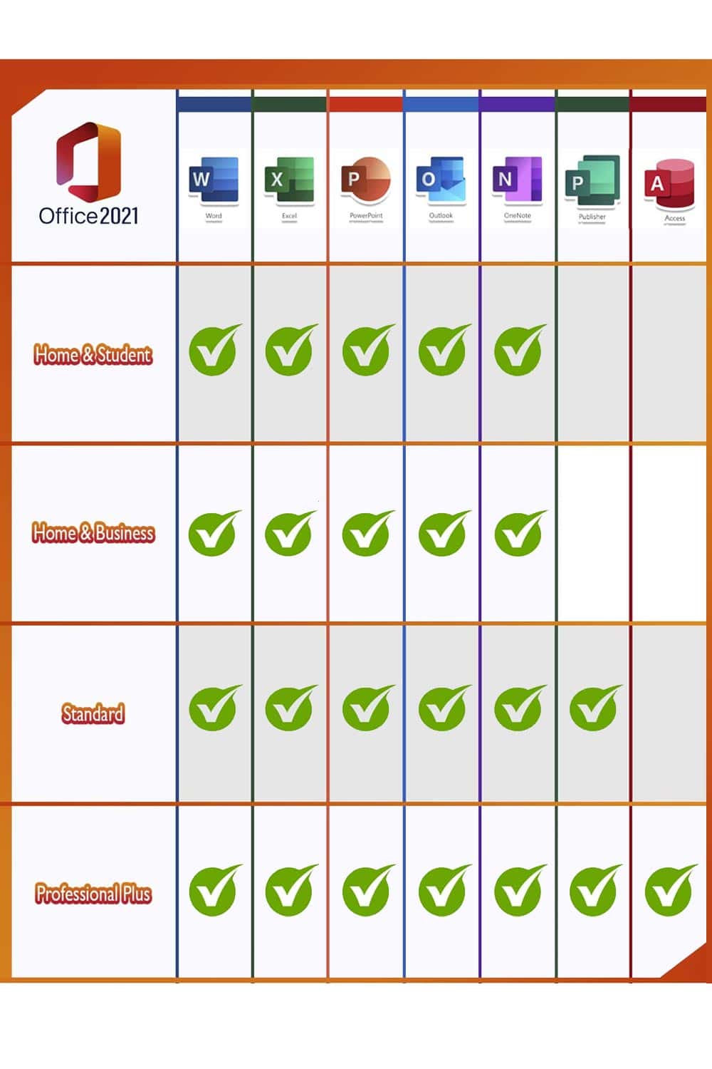 Les utilisateurs de Microsoft Office qui utilisent la gamme complète d’applications à la maison ou au bureau sont bien avisés avec Office 2021 Professional Plus Edition. Tous les programmes importants sont inclus : Word, Excel, Outlook, PowerPoint, Publisher et Access. OneNote est désormais disponible en téléchargement sur le Windows Store afin que vous puissiez rapidement prendre des notes et les rendre disponibles sur tous les appareils via le cloud. En raison du large éventail de programmes différents, la version Standard s’adresse principalement aux personnes qui travaillent à domicile dans le bureau à domicile ou qui recherchent une solution puissante et fiable au bureau pour organiser des documents, des tableaux, etc.